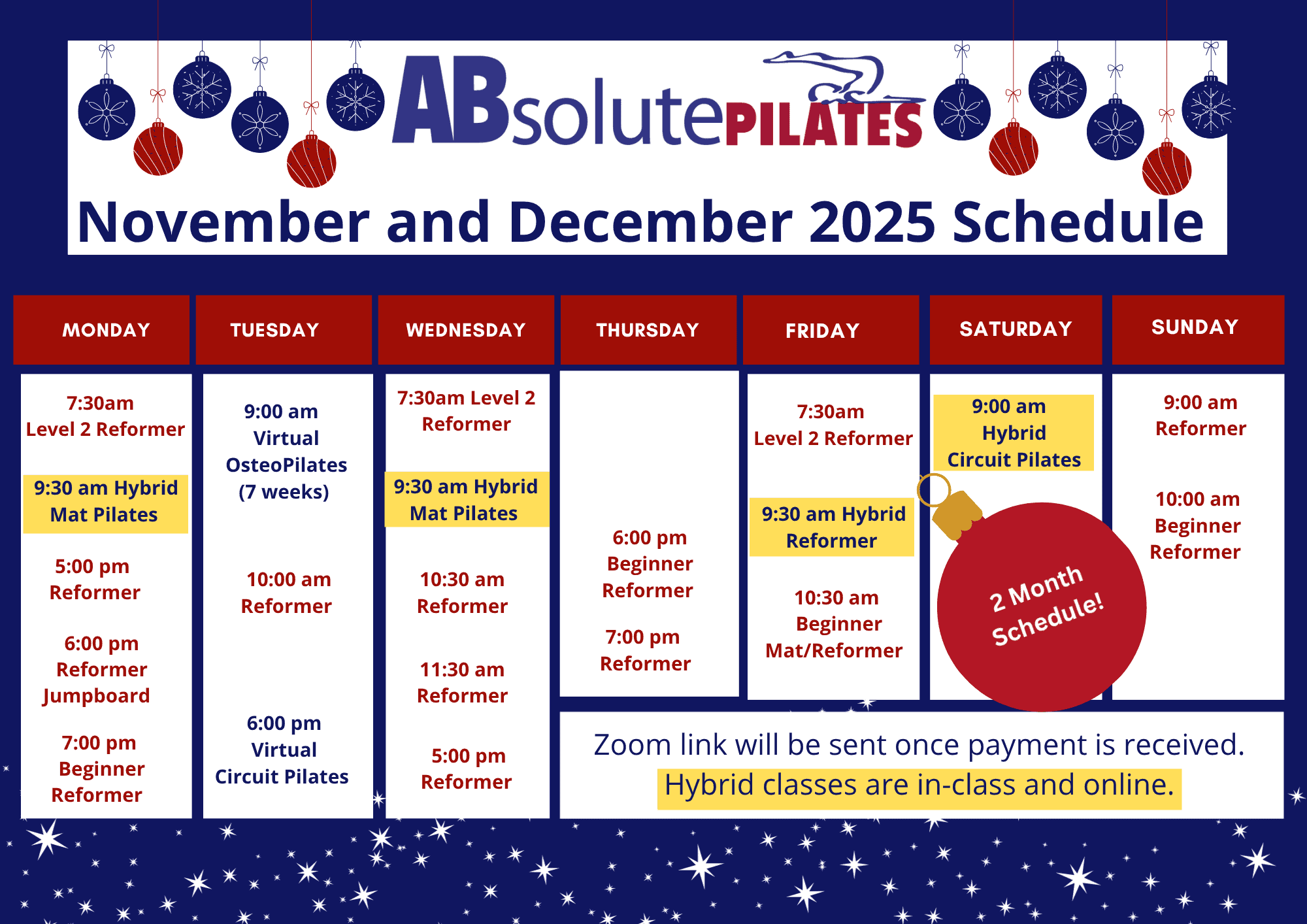 Our STOTT PILATES® certified Pilates instructors run classes throughout the day, evening and on weekends so that it’s easy to fit into your busy schedule.